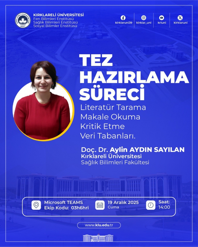 Üniversitemiz Enstitüleri tarafından, 19 Aralık 2025 Cuma günü saat: 14.00'da MS Teams platformu üzerinden çevrimiçi düzenlenecek olan, Tez Hazırlama Süreci Çevrimiçi Seminerine, tüm akademik personelimiz ve öğrencilerimiz davetlidir.